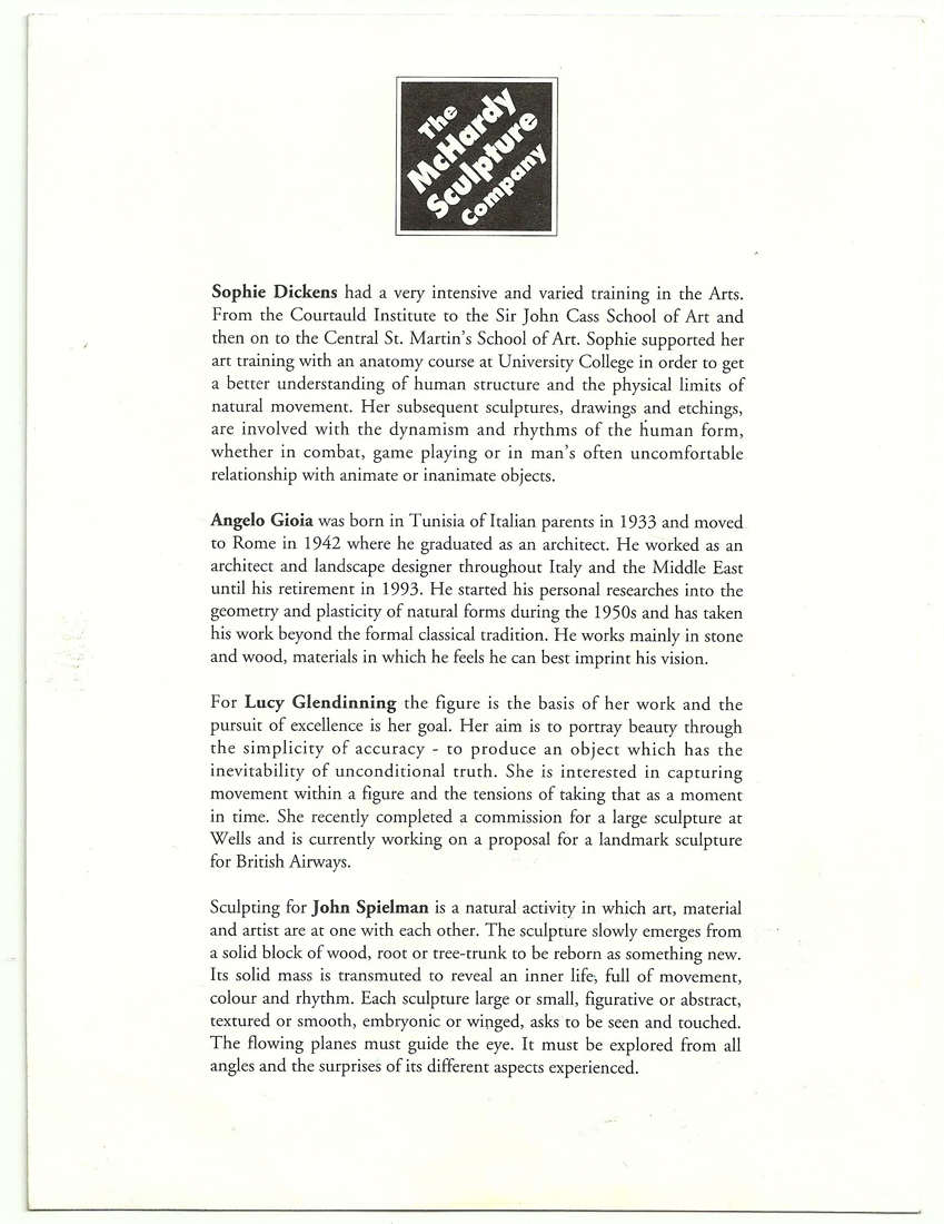 McHardy Gallery The McHardy Sculpture Company Invites you to the private view of "Autumn Exhibition '99" featuring new work by - Sophie Dickens - Angelo Gioia - Lucy Glendinning - John Spielman Wednesday 22nd September 6 - 9 pm Data: 1997 2000 Phto Gallery Luogo: Londra Slideshow Gallery